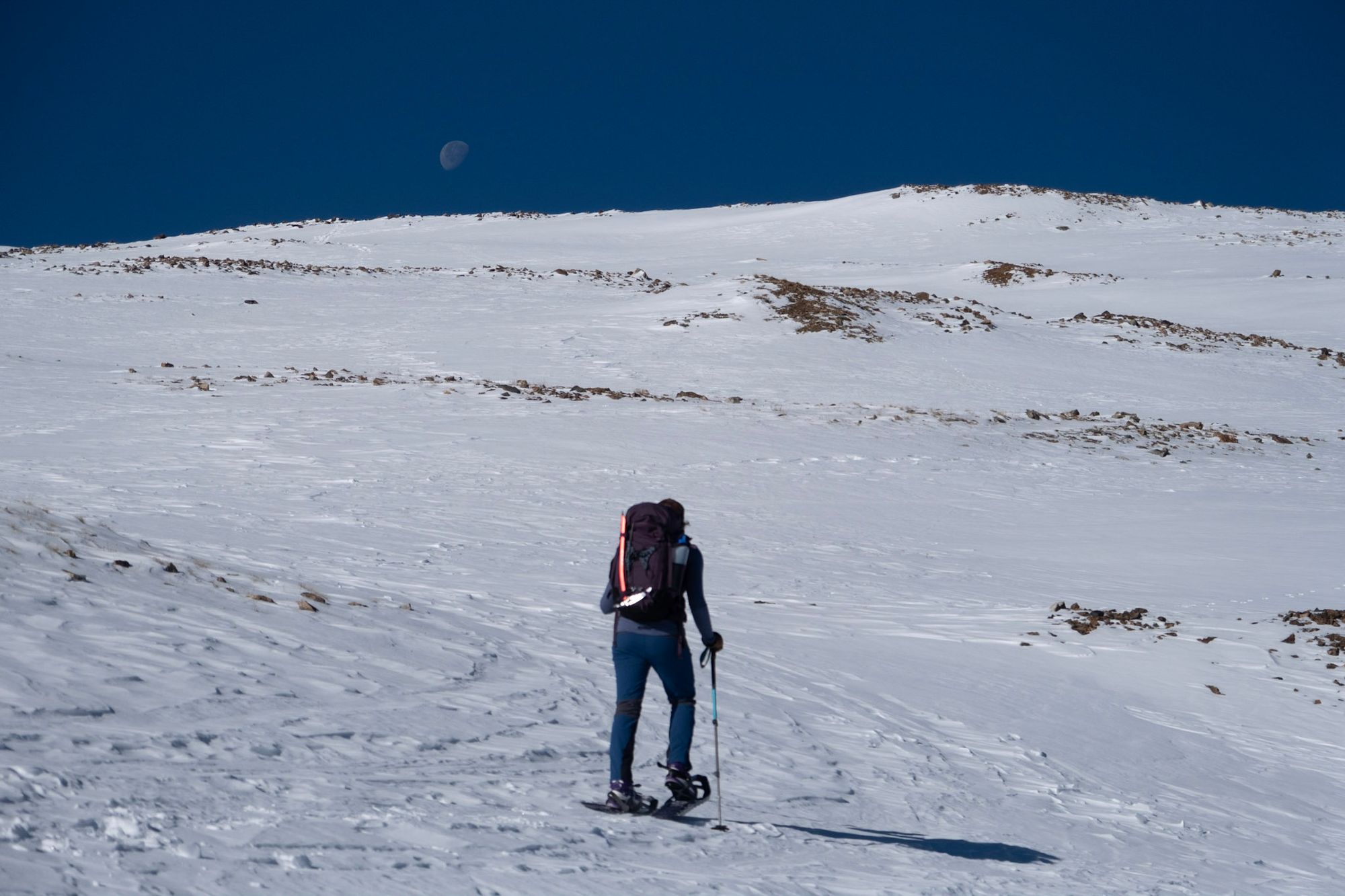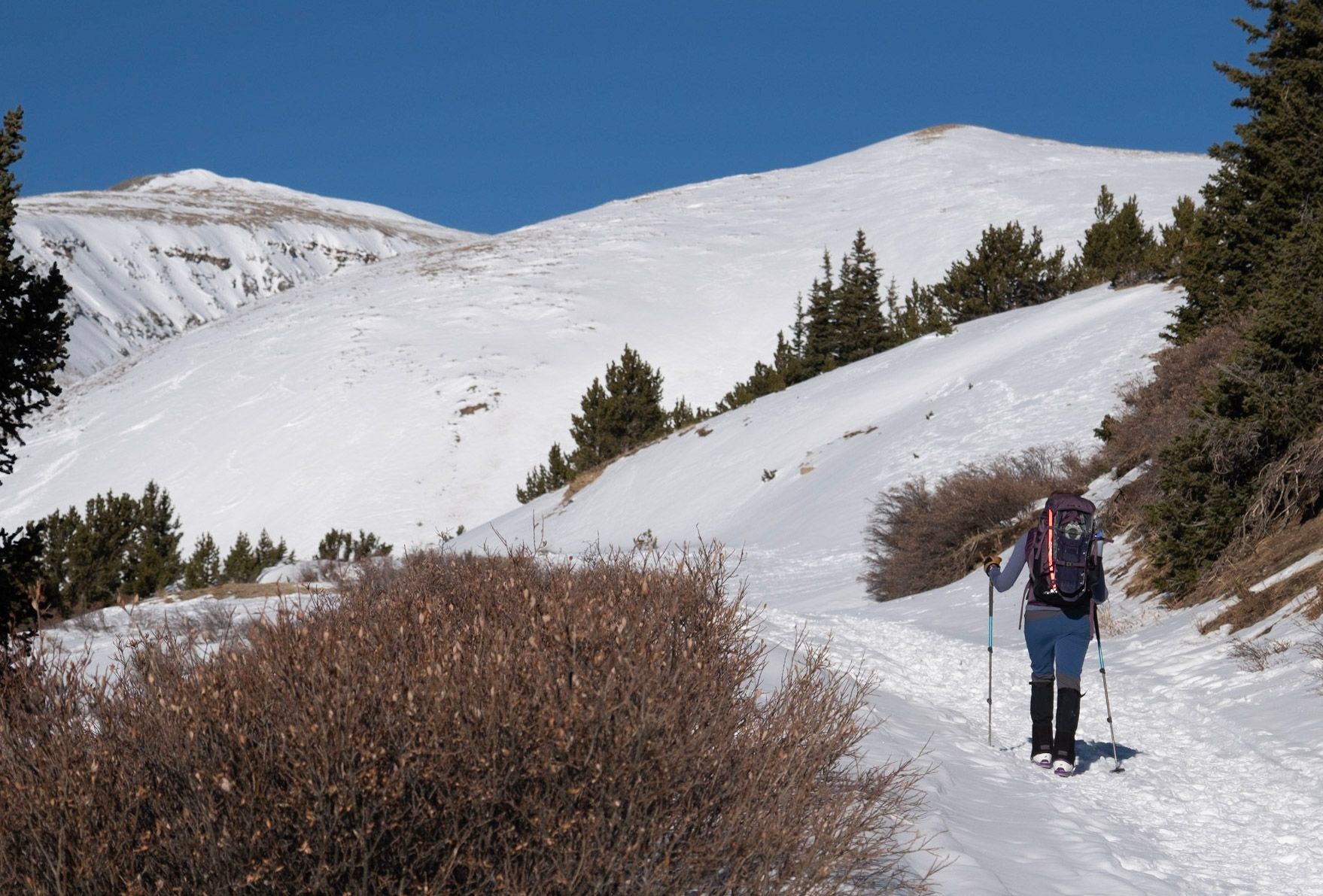 Shelby on the road, approaching treeline.Once we were above treeline, the snow drifts were deeper and we stepped into our snowshoes. Not our favorite way to travel, but when the snowpack is thin and flotation is unnecessary for most of the trail, it is the most practical.