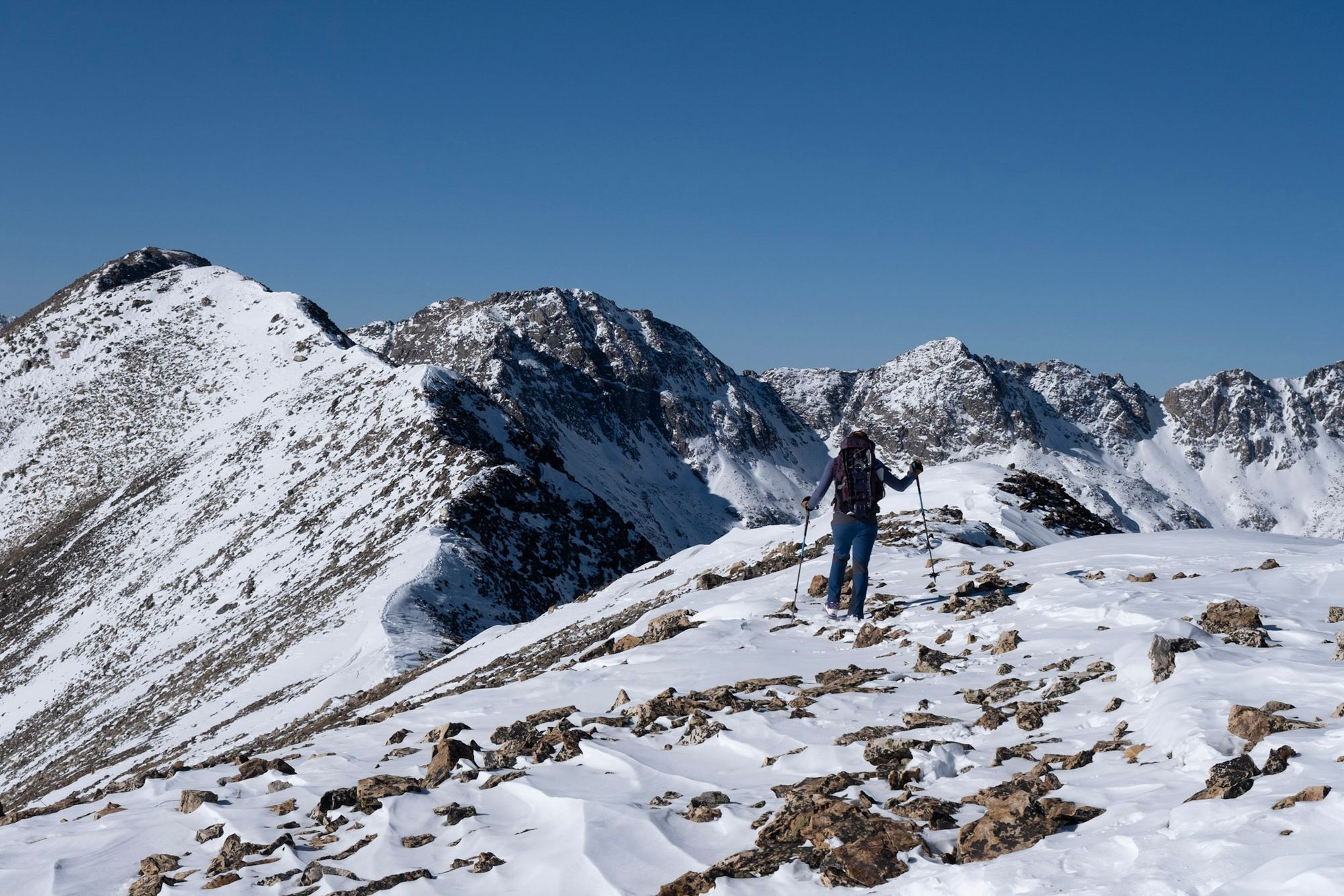 Once on the ridge, the snow shallowed and the ridge alternated between firm wind slab, facets, and rock. Fortunately no ice was on the ridge, and we never needed crampons or ice axes, only trekking poles.