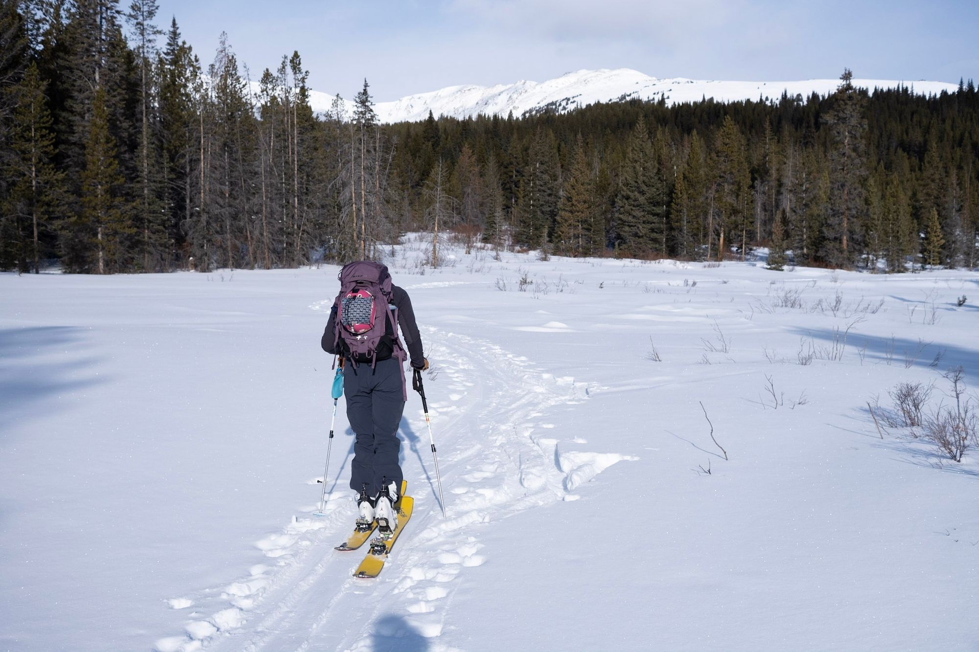 The first several miles of the trail are very gradual and rolling, and we discussed where we would need to put skins back on during our exit. An excellent skin track exists providing access to the 10th Mountain Division Hut accessed from the same trailhead. We followed the trail through forests and meadows, slowly working our way towards the hut.